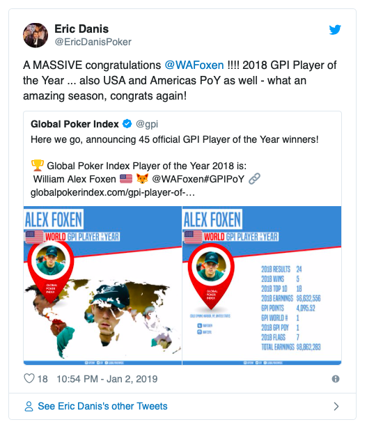 Foxen多年来都以一名成功的双线牌手(线上和线下)著称。2017年,他在线下锦标赛中的成绩为170万美元。所以,2018年的异军突起让所有人惊讶了一把。全球扑克指数(Global Poker Index)主席Eric Danis还特意发推表示祝贺。(大意:要特别恭喜一下Alex Foxen!!!2018 GPI年度最佳牌手!了不起!再次恭喜!)