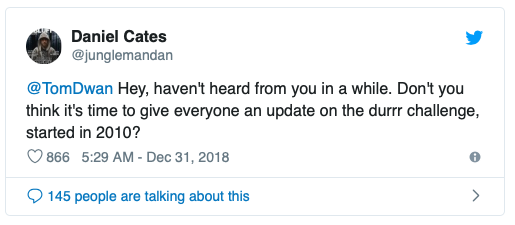 2017年的时候,Cates表示挑战也许会迎来尾声。但是,全年关于Durrrr Challenge挑战的假新闻都没有。