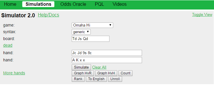 我们需要把这些数据填入一个PLO胜率计算器。我建议使用目前最好的免费软件:http://www.propokertools.com/simulations。