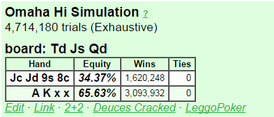 这是根据我们的牌力底池应该归属于我们的部分,也是我们赢下这个底池的频率。这是PLO中数学变得十分重要的一部分,学习数学将为你产生极大收益。