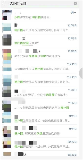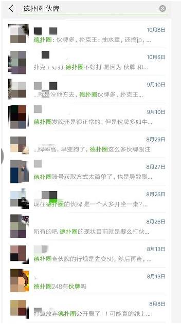 随便一个德扑交流群,查找聊天记录,以“德扑圈 伙牌”为关键字进行搜索,都会搜出玩家们满满的吐槽,不止一个群,也不止一个玩家。