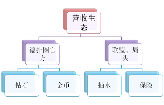 德扑圈平台的营收靠游戏币、钻石的售卖,而牌局过程中产生的抽水、保险等收入集中到了各个联盟、局头中。使平台与联盟、局头形成了两个不同的营收生态与牌局体系。而且这两个营收体系是彼此相对独立的,即平台方不怎么去干预开局的进程,具体怎么开桌、结束、结算,涉及到的争议纠纷,基本上都由一个个局头来决定。