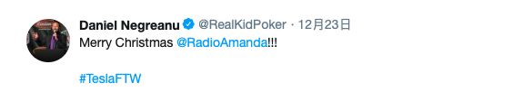 本月豪客碗打响之前他两就已经在一起了,丹牛直接在推特发合照说,“爆一张美照,没有其他,只有感恩。我是个幸福的难以言语的孩子。”随后两人推特互动让众网友吃了不少狗粮,但这还没完,丹牛实力演绎了一次“别人家的男朋友”,他买了一部特斯拉作为圣诞礼物送给Amanda!!!