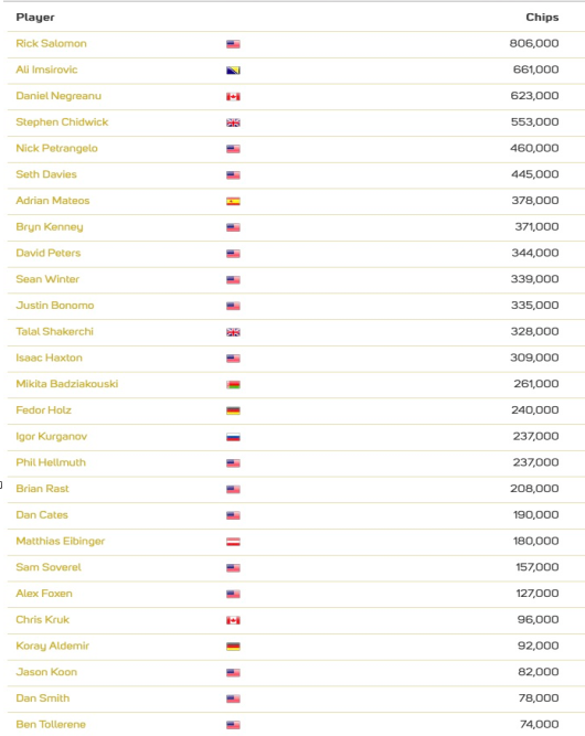 紧随其后的3位选手依次是:Ali Imsirovic (661,000), Daniel Negreanu (623,000)和Stephen Chidwick (553,000)。Ali Imsirovic就是今年在扑克大师赛中走红的牌手,一鸣惊人形容他一点都不过分,小小年纪就能续赢豪客赛并穿走紫晶夹克,Day1中的表现算不上惊艳但牌风异常稳健,能看出坐在一旁的大丹牛对他喜欢的不得了。