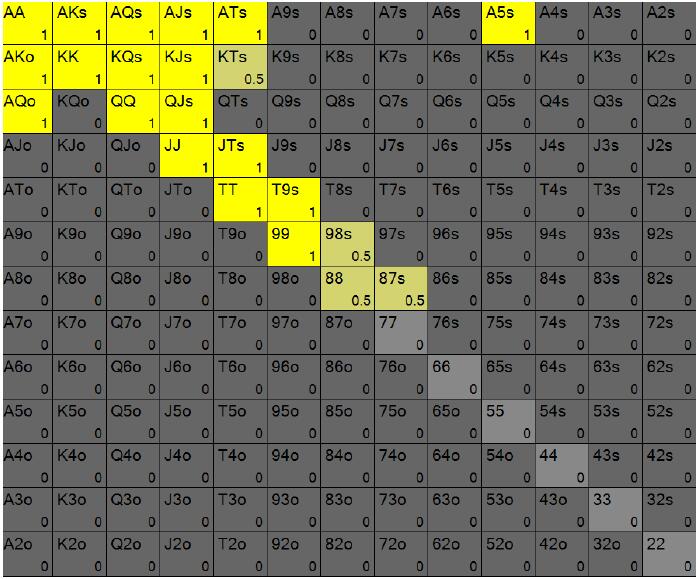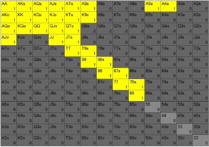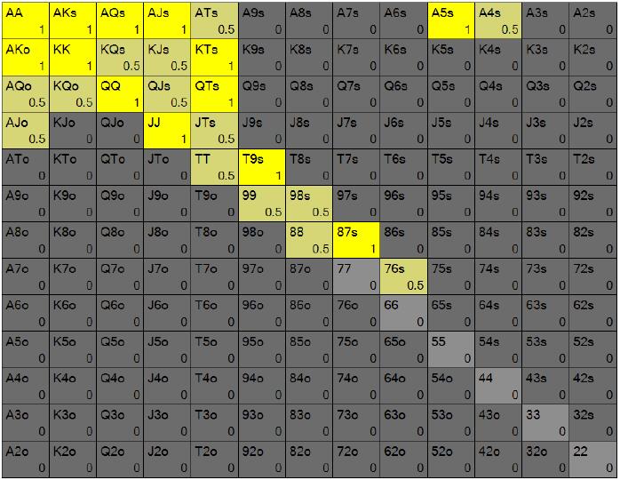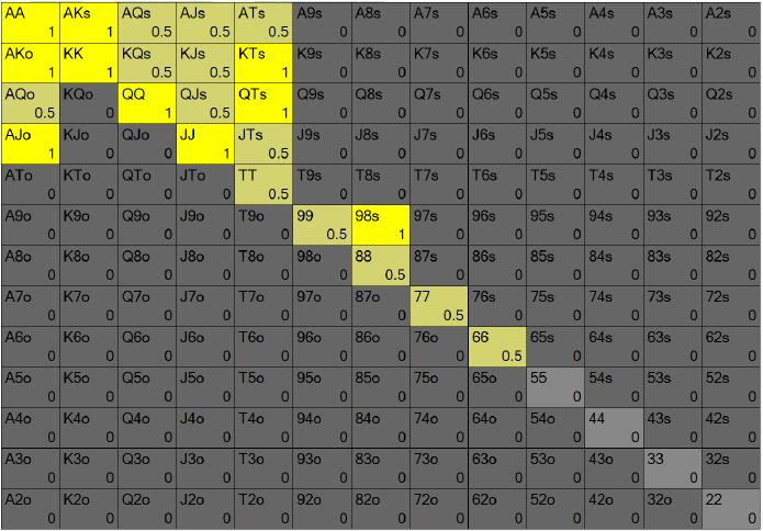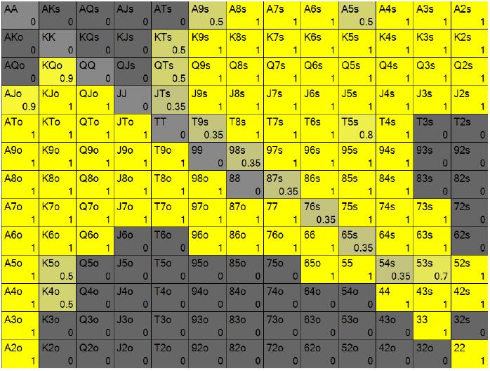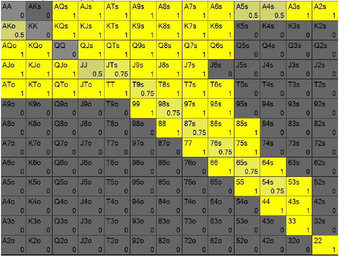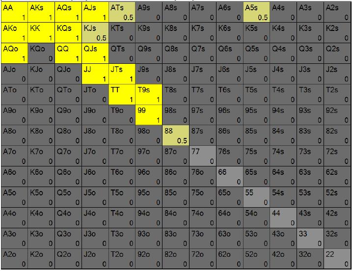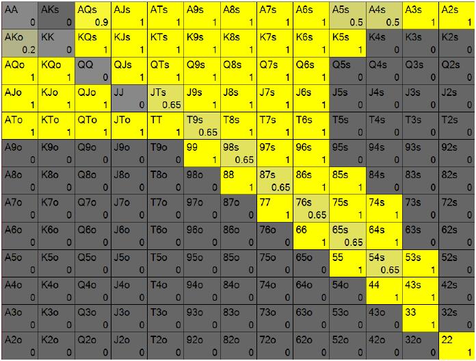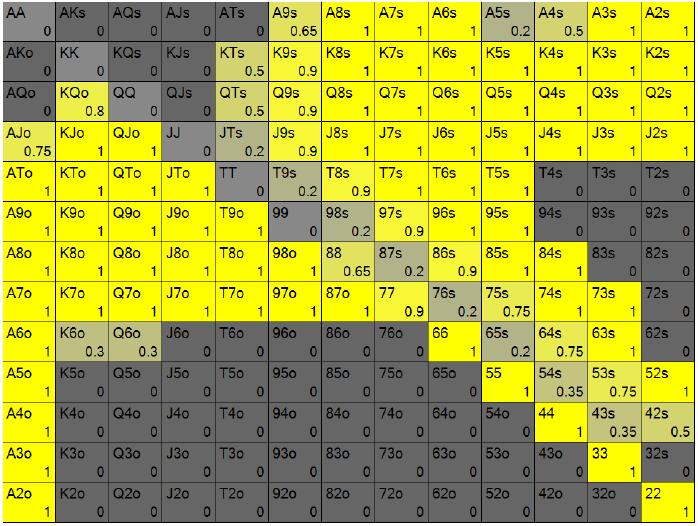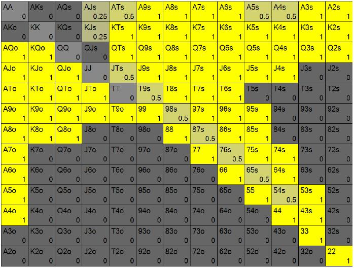 说明:在以上表格中,亮黄色方格代表3bet范围,暗黄色方格代表跟注范围。