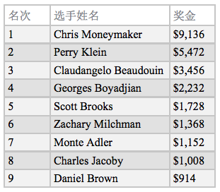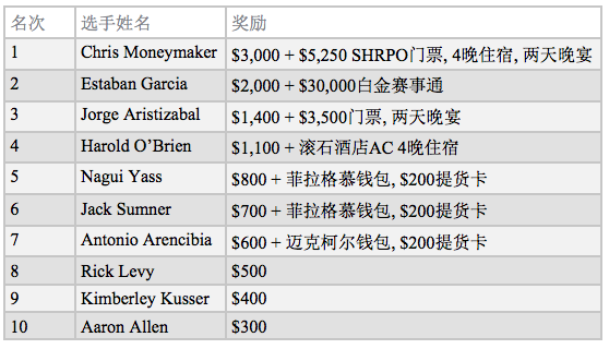 还是和之前的规矩一样,如果Moneymaker赢的比赛冠军,那么比赛的亚军将获得价值$30,000的白金赛事通。所以,比赛亚军Esteban Garcia在赢得$2,000奖金的同时还获得了白金卡。Moneymaker获得$3,000奖金和$5,250 SHRPO大礼包(4晚酒店住宿,两天晚宴)