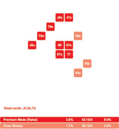 你可能注意到,这个check-raise范围偏重于强成手牌。这是因为,当你在多人底池check-raise时,你通常至少将得到一个跟注。如果你认为自己有更多弃牌赢率,尽管用QT、Q9这样的听牌check-raise,特别是你有一个后门同花听牌的时候。如果你认为check-raise总是被跟注,你可能应该选择用65 check-call或check-fold。