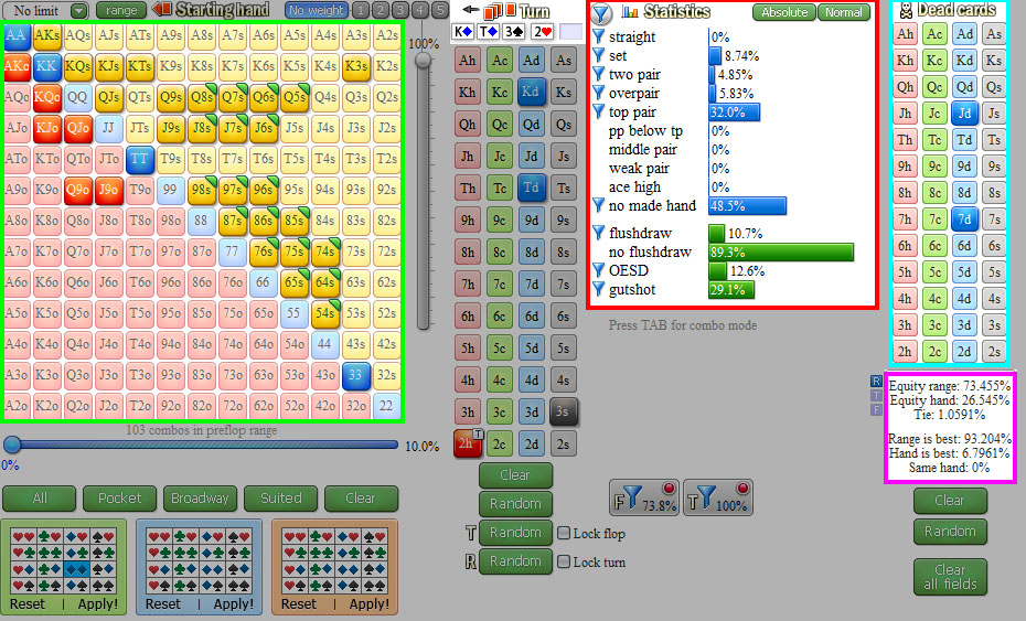 编者注:为了方便不熟悉Solver软件的读者,我们用彩色方框高亮显示相关信息。紫色方框表示胜率,绿色方框表示对手的预计范围,红色方框表示范围的统计数据。