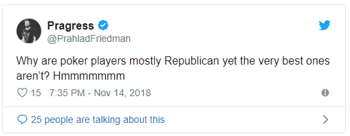 社交媒体如此发达的时代注定了人们更能随心所欲的发表自己的言论。Prahlad Friedman在扑克圈算是口无遮拦的那类人,他想说什么就会说什么,只是大多数时候有点偏激而已。最近,他对那些和自己政治立场不同的人打起了“嘴炮”,他表示共和党派在牌场中的表现是平庸的。