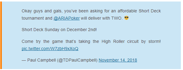 日前官方宣布将在12月2日推出两场“大众可承受的”短牌锦标赛。第一场将于周日当地时间上午11点开赛,买入$240;第二场于同一天当地时间下午7点开赛。