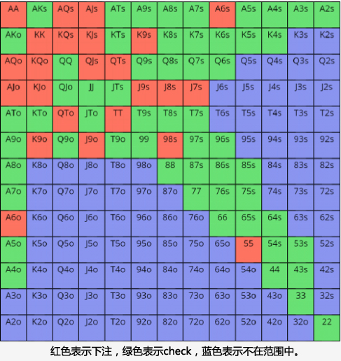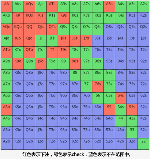 注意:这是一个合理的简化范围。理论完美的下注范围应该仍然包括少数中等牌和稍微多样化的诈唬牌。
