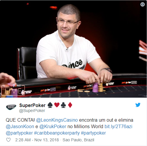 捷克帝王娱乐场老板Leon翻牌圈击中三条,加拿大豪客牌手Kruk同花听牌,顶级牌手Koon击中三条且牌力高于Leon。这不是鱼儿戏水的池子,这是鲨鱼厮杀的海平面,所以三方毫不犹豫将所有筹码推向了桌中央。