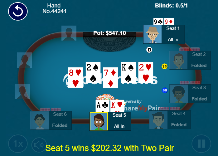河牌圈环节5号选手进行了全押,1号选手跟注,对5号选手返池$344.78后底池为$202.32。亮牌环节不出意外,庄位选手底牌为9c-9d,5号选手底牌为Ac-Kh。