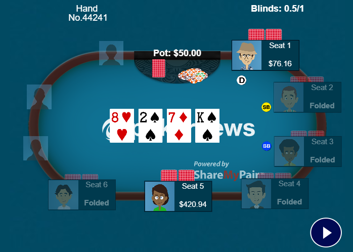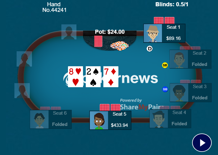两名剩余的选手进入翻牌圈,翻牌8h-2s-7d,底池$24(相对较低),两名选手均过牌。