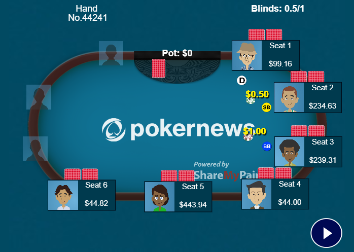 这是一手100NL ($0.50/$1)线上牌局,6人桌,2号和3号为盲位,4号位短额选手开局加注至$2.50。5号位选手3bet至$10。由于这两位选手都处在前位,而短额选手开局只有$44,所以另一前位选手的3bet不像是诈唬。