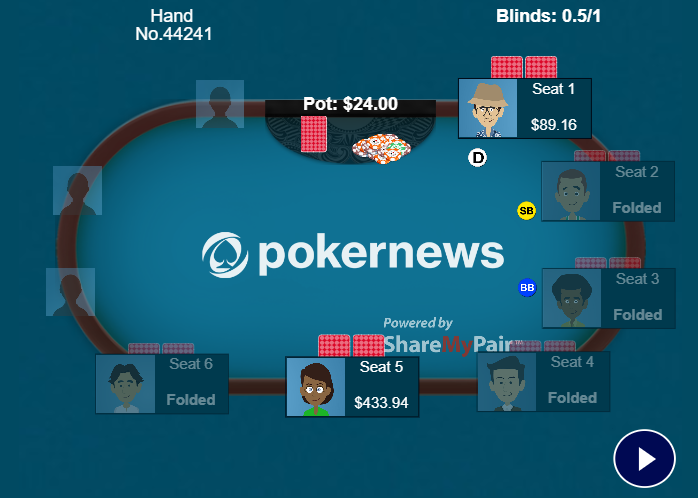 6号选手弃牌,1号玩家开局额度接近$100,选择跟注3bet。5号位之前的选手全部弃牌,4号选手也许意识到了这手牌对自己不利。