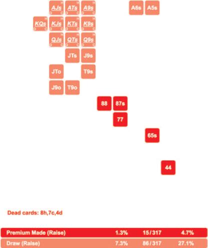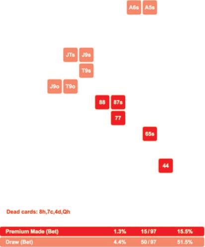 这个范围仍然包括太多听牌。如果你希望进一步平衡你的范围,也许A6s和A5s和几种卡顺听牌组合应该check。这个范围现在存在的一个问题是,如果你用更多听牌check,你的check范围变得严重倾向于垃圾牌。如果你觉得对手在你check时将盲目地用他的整个范围下注,你也许应该用你的所有同花听牌和成手牌check-raise全压,虽然那会使你的卡顺听牌处境艰难。虽然你的下注范围和check范围都比较弱(因为你较宽的check-raise范围),但这是接近平衡的。