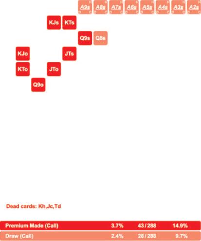 这是一个对你很困难的局面,当你作为翻前跟注者在不利位置游戏而翻牌圈发出三张大牌时,你往往会陷入困境。你通常被迫用一些非常弱的牌防守,或者在超过你公平份额的时候check-fold,让这成为对手用宽范围下注的好场合。因为对手在这个翻牌面的范围强度,你不应该有一个太宽的加注范围。因为对手用较宽的范围做持续下注,这可能是用你的强成手牌以及Q8s和一些具有后门同花听牌的同花Ax牌check-raise有好处的一个迹象。注意,98和其他弱顺子听牌被放弃,因为它们在改进时可能被更好的顺子击溃。