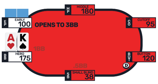对抗后面位置的率先加注(open raise)用AK 3bet和对抗前面位置及中间位置的率先加注用AK跟注通常被认为是正确的。