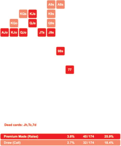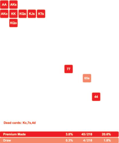 我们要注意的第一件事,是这个范围让对手在100%的时候下注,这往往是不现实的。一些不那么疯狂的牌手用他们的绝对垃圾牌check,而其他更能干的牌手用他们的边缘成手牌和垃圾牌check。虽说如此,如果对手用范围中100%的牌下注,他将只在23%的时候拿着顶对或更好成手牌、听牌。如果他对抗你的翻牌圈加注用所有比A4(踢脚最好的底对)好的牌防守,你的所有诈唬牌(假设你被跟注后没有任何胜率)将是接近不亏不盈的。