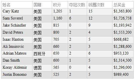 《中央扑克》2018年度最佳豪客玩家排行榜前10: