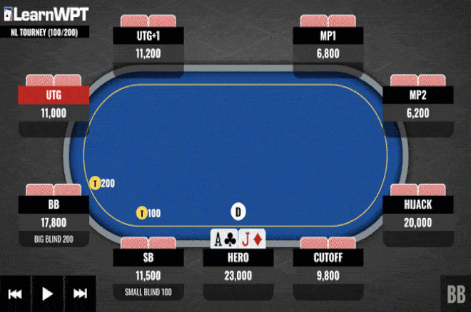 这手牌来自一个无限德州扑克锦标赛。盲注100/200,桌上玩家筹码量如图。翻前,MP2玩家率先加注到3BB,劫位玩家跟注,你在按钮位置用A♣ J♦再加注到11BB,大盲玩家、MP2玩家和劫位玩家都跟注。翻牌是9♣ 10♥ 4♠,前面三个玩家都check,轮到你行动,你会如何行动?