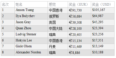 Tsang和Bulychev的单挑对局并不让人感觉到意外,在187人次的选手队伍中他俩一直处在筹码量上游。在终极四强的时候,Tsang再次获得筹码量优势并领先到最后夺冠。今年夏的时候,他就在拉斯维加斯的 $10,000底池限注奥马哈金手链赛事中取得了第10名,获得奖金$67,210。
