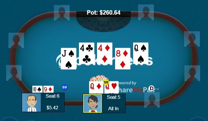 河牌是Q♠,使得公共牌最终定格为J♠ 4♣ 4♦ 8♦ Q♠,小盲玩家再次check。