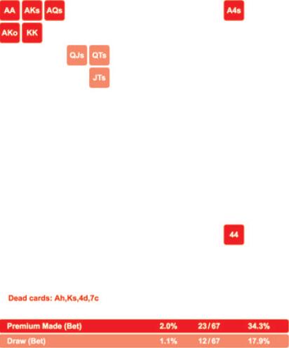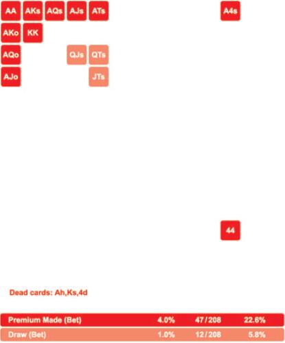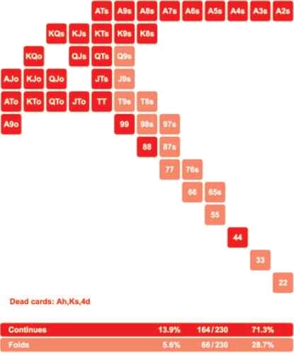 这个范围假定弱手将总是用卡顺听牌继续游戏,这个是一个乐观假定。我总是建议你首先考虑最糟糕的情况。在这种场合,他将在29%的时候弃牌。这意味着,如果你下注底池大小的40%(这个诈唬下注尺度需要在28%的时候成功),你的所有对抗对手跟注范围零胜率的牌将获得直接收益。显然,你下注范围中的许多牌对抗对手的跟注范围有一定的胜率,因此,为确保他更频繁地弃牌你其实可以下注更大一点。
