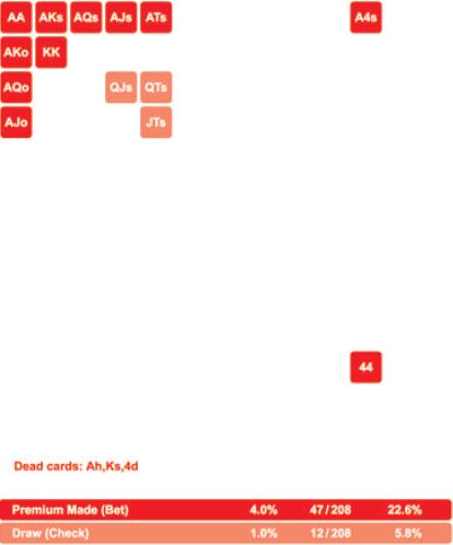 你有100BB有效筹码,在中间位置加注到3BB,只有按钮玩家(比较强的思考型牌手)跟注。翻牌是A♥ K♠ 4♦。你应该这样游戏你的范围(见图170)。