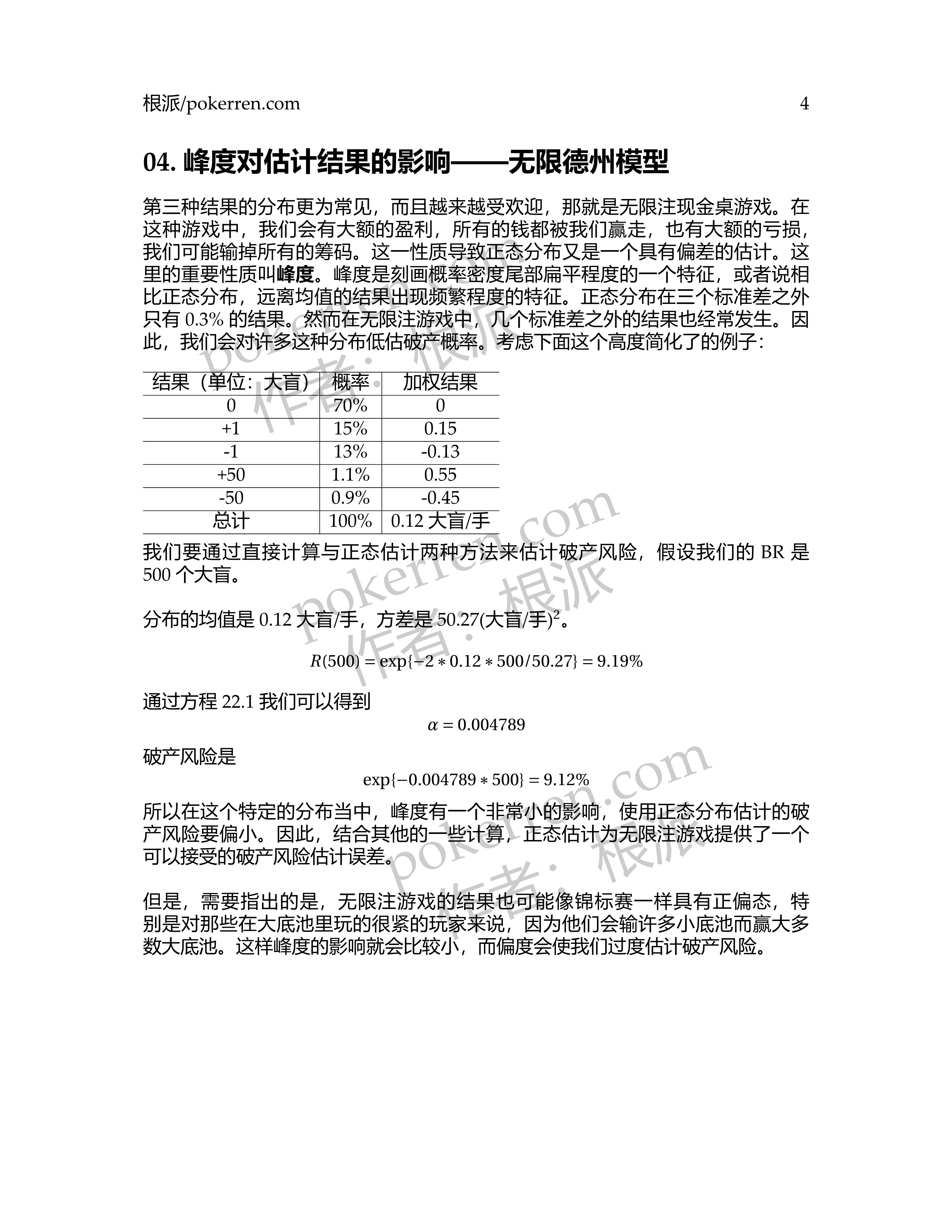 在这一节中,我们将研究峰度变化在正态分布假设下对破产风险的影响。无限注德州的游戏结果是一个高峰度的分布,通过这一节的内容尅一发现,峰度对正态假设给出的结果不会造成太大影响。
