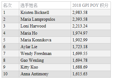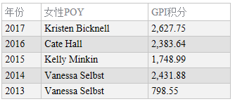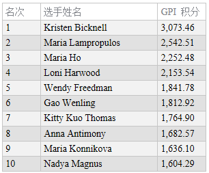 GPI女子排名:Kristen Bicknell位居两榜之首