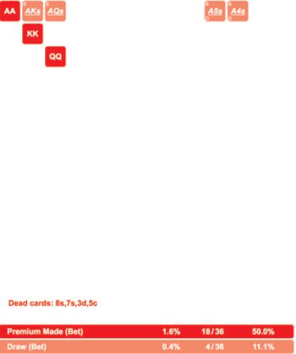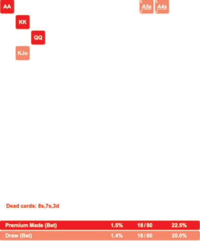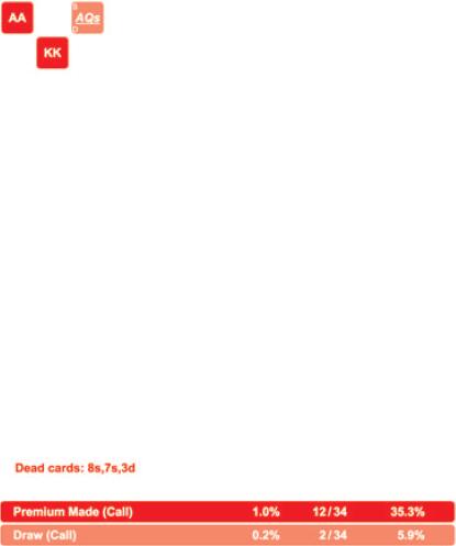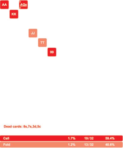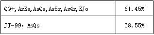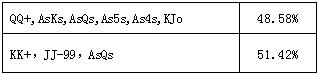 看到99跟注而JJ和TT弃牌你可能感到惊讶,但这是因为99拿到了一个卡顺听牌。需要再次提醒的是,如果AA和KK不在这个范围中,对手将只用99和A♠ Q♠跟注,这远非理想的情况。如果没有AA和KK,他只能用范围中19种组合中的7种组合跟注,而且跟注的牌几乎无利可图。