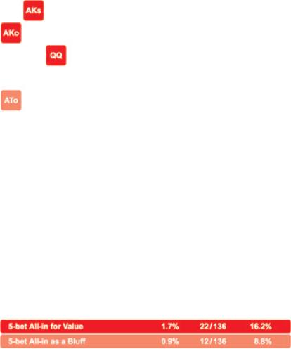 确定一个在不利位置对抗4bet的好范围很困难,因为你往往在翻后难以继续游戏。注意,对手的大对子只是跟注。这主要是为了加强他的跟注范围,让他难以对抗。如果他用AA、KK做5bet全压,他的跟注范围变得非常弱,而且他为了维持平衡不得不增加少数诈唬牌组合。唯一的4bet诈唬牌是ATo,因为它有不错的阻断牌能力。