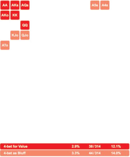 这个4bet范围包括你的所有强牌,少数带阻断牌的大高张和少数同花Ax牌。这个范围对抗能干的对手是合理的。当然,如果对手是只用坚果牌3bet的超级紧弱者(nit),你应该选择只用AA和KK做4bet,并用得到正确潜在底池赔率的牌跟注。