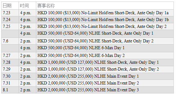 HKD 500,000 (USD $64,000)无限德州短牌扑克(大盲底注)开场在7月25-26日举行,接下来的是HKD 500,000 (USD $64,000) NLHE六人桌赛事(7月26-27日),HKD 1,000,000 (USD $127,000) NLHE 短牌扑克(大盲底注)举办时间为7月28-29日。