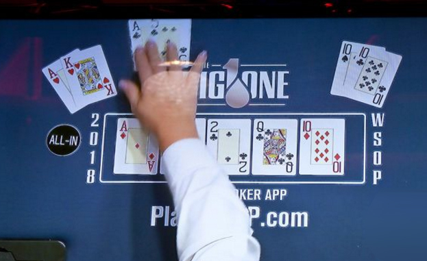 翻牌是3♥ Q♦ 10♥,Bonomo过牌,Siegal迅速全压他的剩余482万筹码。Bonomo使用了两次延时,然后决定用他带后门同花听牌的两端顺子听牌跟注所有筹码。