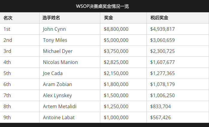 决赛桌最后六名选手都是美国人,因此他们的扣税比率基本相似,但会因为各州政策的不同而有细微差异。冠军选手John Cynn的奖金预计将严重缩水,从880万美元减少到不足500万美元。