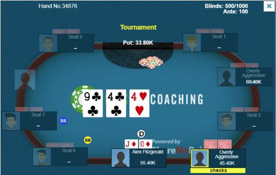 2. 接上题。你3bet到14500美元,初始加注者弃牌,3bet玩家跟注。翻牌是9♣ 4♥ 4♣,底池现在有33800筹码。CO玩家check。你还剩45BB有效筹码。你会怎么做?