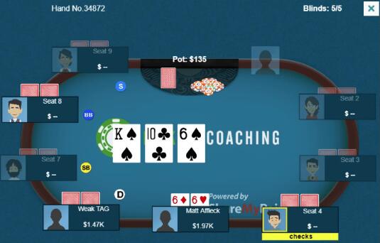 2.接上题。你跟注,按钮玩家和大盲玩家也跟注。底牌现在有135美元。翻牌是K♠ T♣ 6♠,大盲玩家和初始加注者check,你会怎么做?