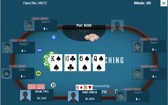 这手牌来自百乐宫赌场盲注5/5/10美元的无限德州扑克现金桌。整个牌局过程在Twitch平台直播,底牌可见(有30分钟的延迟)。最小买入是1000美元,最大买入是2000美元。你买入2000美元上桌。需要说明的是,这种牌局有三个盲注,这种设置偶尔会使你的策略和“标准”的二盲注牌局有些不同。牌局由一些经常在这儿打牌的常客玩家和少数对直播感到好奇的休闲玩家组成。
