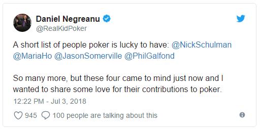 本周初的时候,Daniel Negreanu发了一条Twitter,他认为扑克圈有这4位扑克玩家是一种幸运。(扑克因有你们而幸运:@NickSchulman @MariaHo @JasonSomerville @PhilGalfond。我知道除了他们还有很多人,但他们4位是我当下能想到的,面对他们对扑克圈的贡献,我想将我的关心告诉他们!)
