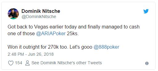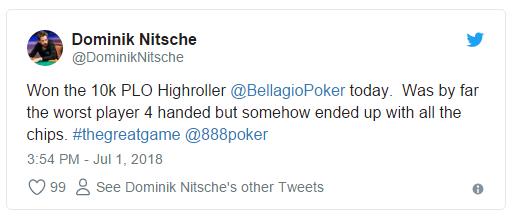他在2018 WSOP赛事中只取得了两场赛事的最低奖金,但离开了WSOP赛场,Dominik Nitsche在豪客赛场中却找回了自己。