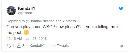 Dominik的粉丝都为他在豪客赛中的胜利感到高兴。但是,其中有一名粉丝希望他能够参加更多的WSOP赛事,似乎是因为这位粉丝在今年的WSOP赛事中投了Dominik的注。