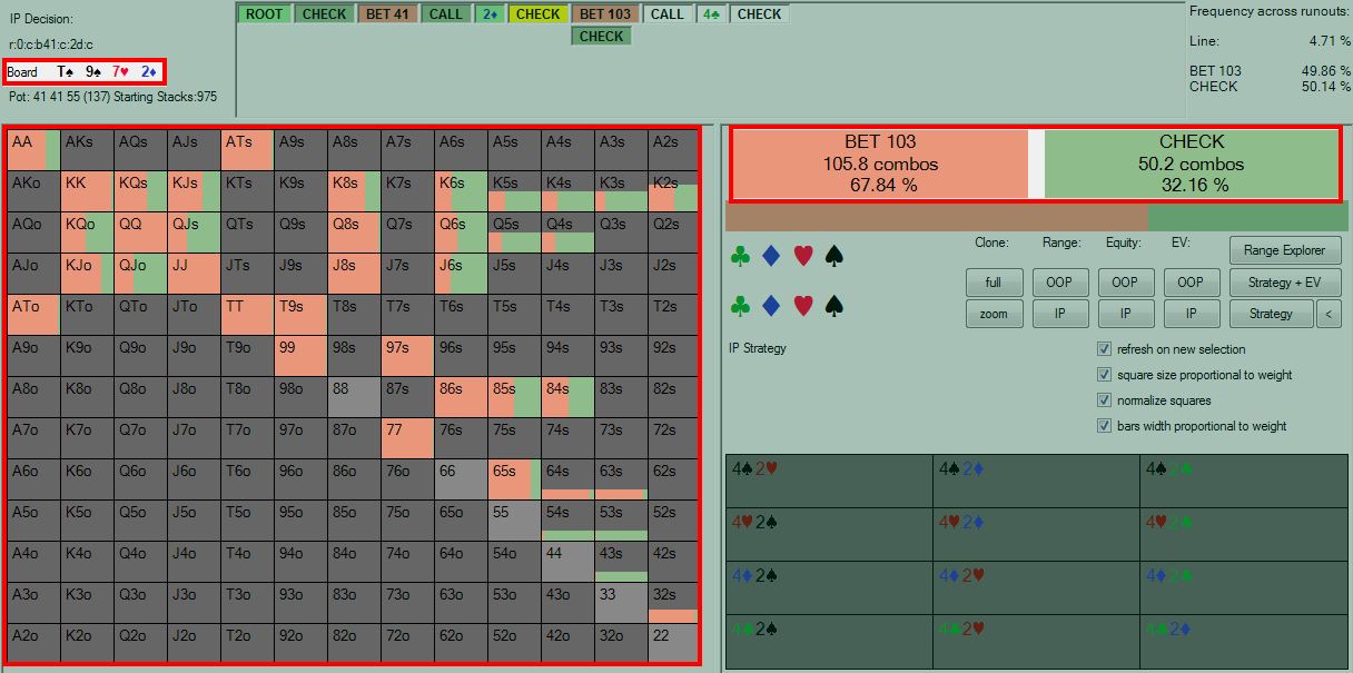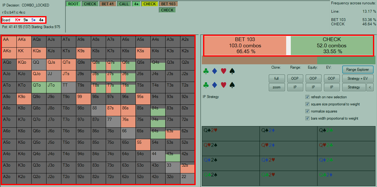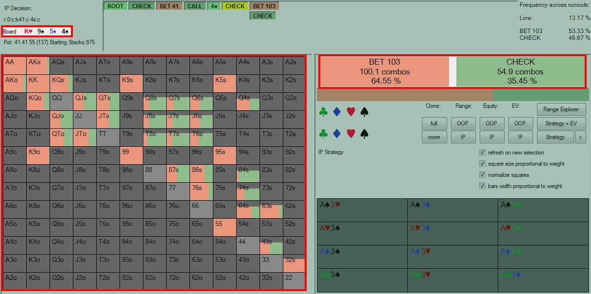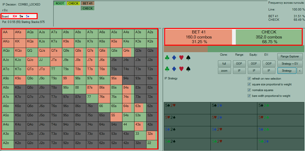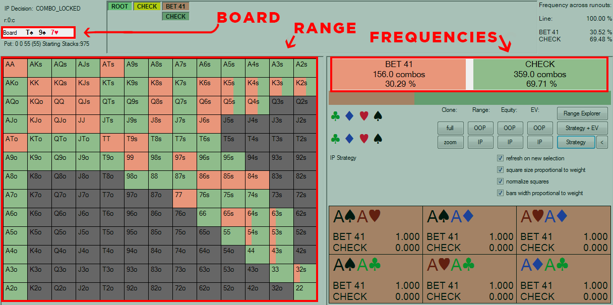 编注:为了方便不熟悉解决者软件的读者,我们将图片中相关信息用红色方框标注。BOARD:公共牌;RANGE:范围,FREQUENCIES:下注频率和CHECK频率。