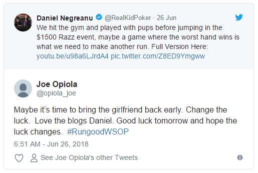 Joe Opiola推特大意:也许你应该尽早的把女朋友找回来。冲冲你的牌运。喜欢你的博客。希望你明天能有好运也希望你的运气能有改善。