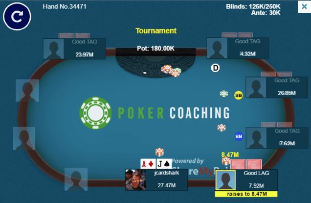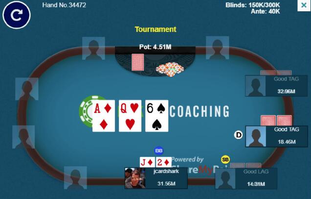 跟注可能看起来是个好主意,因为通常对抗一个很可能是强牌的前面位置加注,你不想用AJ做大底池。但是,你的所有对手都玩得很好,很可能某个尚未行动的人会再加注,迫使你弃牌。此外,初始加注者可以轻易统治你,这是你不想看到的。因此,弃牌是一个完美的有效选择。再加注也是一个不错的选择。虽然这往往导致初始加注者全压,但这也会使他范围中较弱的部分(比如77、AJ、KQ和98s)处境艰难。虽说如此,如果他打算用自己的整个翻前加注范围全压,跟注或弃牌都是更好的策略,因为你通常没有跟注全压所需要的正确底池赔率。