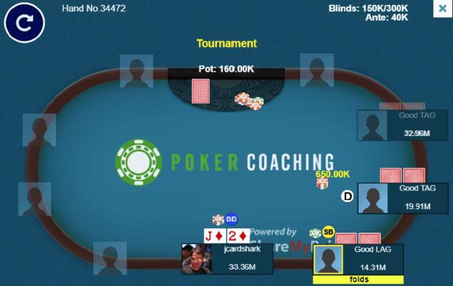 1.比赛只剩下四名选手。盲注15万/30万,前注4.5万。桌上玩家筹码量如图。一名优秀的紧凶牌手(2060万筹码)在按钮位置加注到65万,小盲玩家弃牌。你在大盲位置拿着J♦ 2♦。你会怎么做?