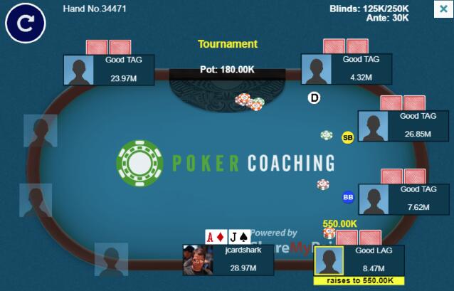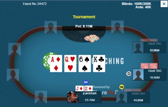 判断是否跟注时你首先应该考虑的是底池赔率。你必须投入约700筹码去赢得一个1753万的底池(如果你跟注),这意味着你需要在40%的时候(700/1753)获胜才能不输不赢。虽然跟注可能是种诱惑,因为你打败了对手的所有诈唬牌,而对抗中等对子是五五开掷币对决,但你必须果断弃牌。对抗一个包括99+、AJs+、AQo+和KQs的范围,你的AJo只有31%的胜率。如果对手用77+、ATs+、A5s-A2s、AJo+、KJs+和KQo全压,你的AJo只有43%的胜率,使得跟注勉强不亏不赢。因此,除非对手是个纯粹的疯狂型玩家,你应该弃牌。