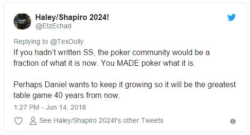 推特大意:如果你没有写《超级系统》,扑克圈可能只是如今盛况的一部分。你成就了扑克的现在。